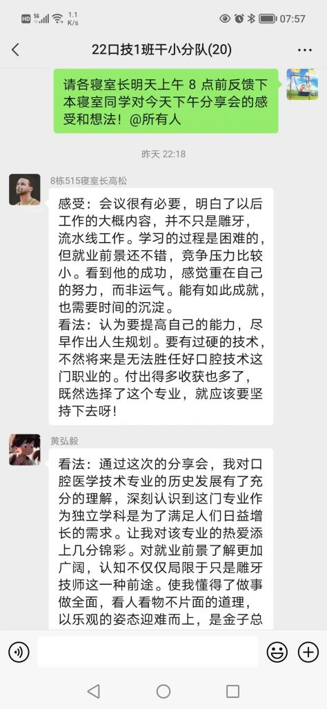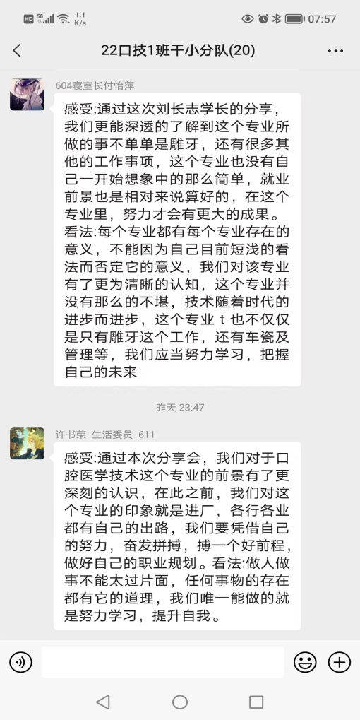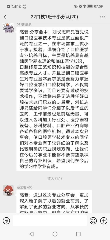 刘长志同学作为我院优秀毕业生代表,在学生时期就先后荣获全国卫生职业院校口腔技能大赛雕牙排牙三等奖,深圳市口腔修复工职业技能大赛三等奖的荣誉。毕业后短短四年时间,已成长为浦江口腔医院技工室主管。宣讲中,刘长志结合自身奋斗的历程和从事行业,从专业发展历史及现状、固定修复义齿制作流程、数字化在口腔行业中的发展与应用及专业发展方向等方面做了介绍,同时用朴实的语言为学弟学妹分享了自己学习和工作中的亲身经历和感受。现场气氛活跃,同学们积极互动。