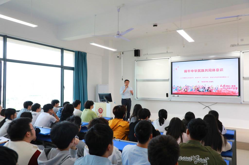彭维杰在课堂上,结合历史典故与新时代实践,从铸牢中华民族共同体意识的丰富内涵、重大意义及青年大学生践行路径三方面展开讲解。他以通俗语言回顾各民族交融共生的历史,阐释其对国家统一、民族团结、社会稳定的关键作用,勉励同学们将个人理想融入民族复兴伟业,在日常中维护民族团结,以实际行动践行 “休戚与共、荣辱与共、生死与共、命运与共” 的共同体理念。